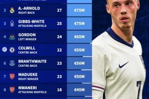 - 2025-11-17德转列缺席本期英格兰名单身价榜:帕尔默居首,阿诺德次席